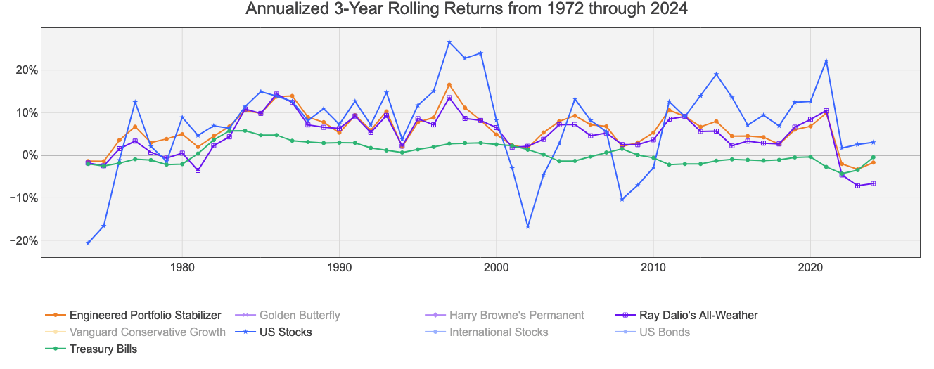 In the below four plots, I compared the performance from 1972 through the end of 2024 for a few stabilizing portfolio options I’ll elaborate on next in purple, a few key asset classes in blue, Vanguard’s conservative growth fund as a benchmark (60% bonds, 40% stocks) in yellow, and US treasury bills in green. I’ve also added in orange the “Engineered Portfolio Stabilizer.” The top left plots the average nominal return (before accounting for inflation) against the volatility of annual returns. You’ll notice that the purple and orange seem to bulge out a bit toward the upper left meaning they offer better risk adjusted returns. This becomes more pronounced when we plot the real (after accounting for inflation) annualized return against the downside risk on the bottom left plot. I prefer looking at the annualized return vs the average return because averages equally weight gains and losses when we know that mathematically this isn’t how compounding gains/losses work. For example, if one year a portfolio gains 10%, the next year it loses 10%, that average of 0% would suggest it was a wash, you’re back where you started. But you’re not, you are 1% lower. I also prefer looking at downside risk which only quantifies the volatility of losses because an investor typically won’t mind too much about the volatility of their gains. This “bulge” towards the upper left (attractive risk adjusted returns) becomes even more pronounced in the bottom right plot when we compare the average three year return vs the volatility of those three year returns, which you can visually confirm by looking at the time series plot above. Last, but not least, is the upper right plot, which I think is the most compelling, that shows you the worst case scenario. Here I plotted the 15th percentile 3-year return (85% of the time it does better than this) against the maximum drawdown. In order to benefit from the upside of a mostly stock portfolio, you would have had to endure nearly a 60% cumulative loss. And just under 20% of the time, you would have had to endure sustained losses that took longer than three years to recover. That is hard to do my friend! Unless, you had some percentage of your overall portfolio allocated to one of those “stabilizer” options that would have better preserved capital, even gaining, while a more stock-heavy portfolio sustained losses!