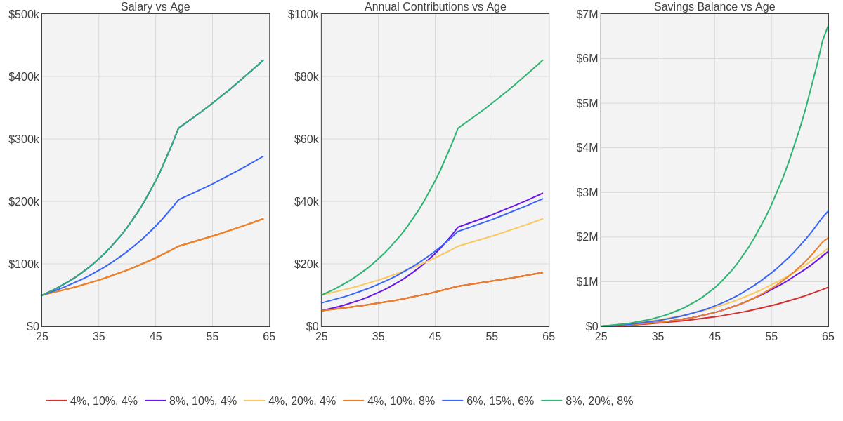 - Salary Growth (4%, 6%, 8%) – Resulting in a salary at the age of 64 of $172K, $272K, or $427K. (I assumed only a 2% gain in salary from age 50 onward regardless of scenario).