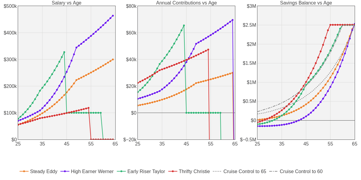 - Early Riser Taylor – Starts with some debt but quickly starts making and saving a lot of money, 20% of their income from the start which enables them to settle into cruise control at 45 and retire at 60 (think engineers, scientists, finance, etc.).
