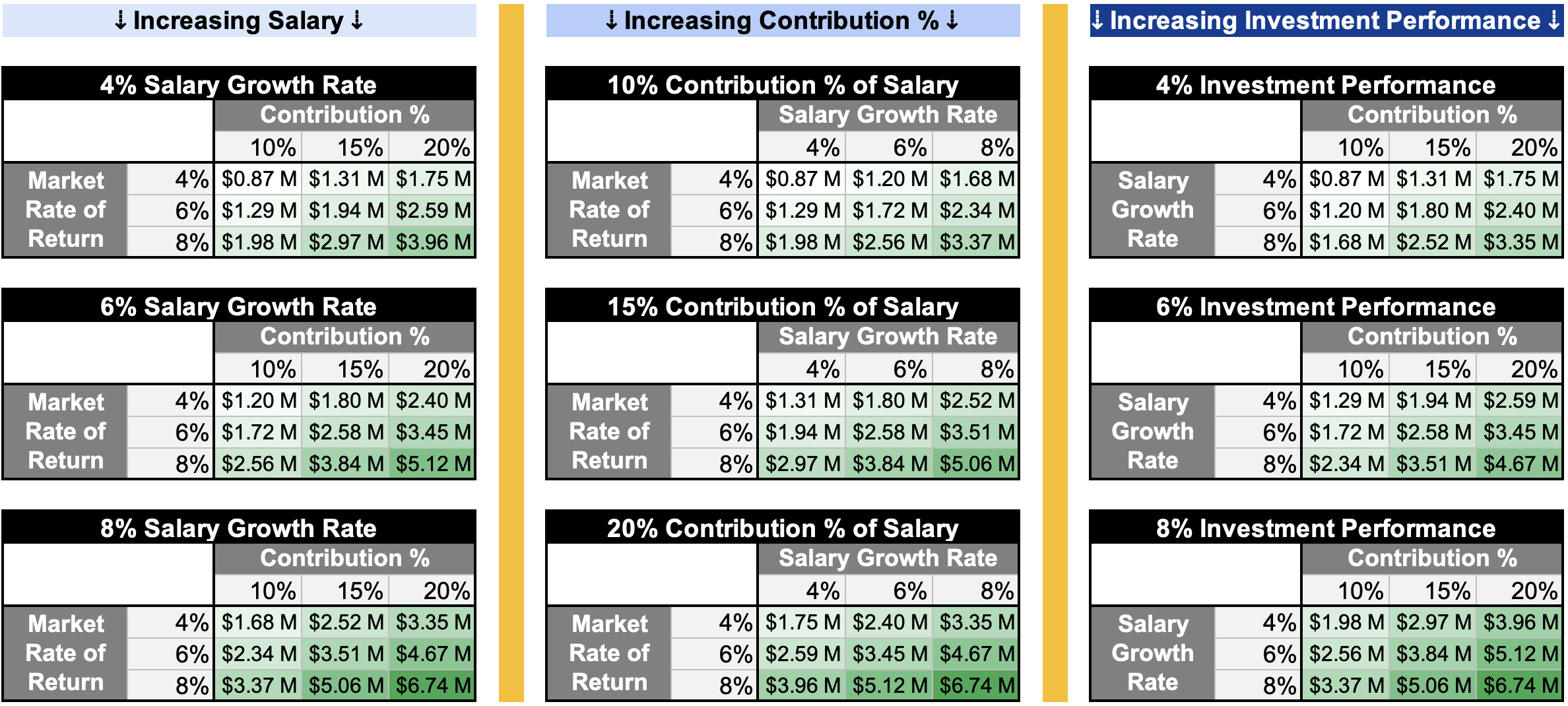 Visualizing the impact of three input variables in two dimensions isn’t easy! So I went with this approach of generating 9 sensitivity tables showing the balance at 65, each fixing one of the variables at a single value while varying the other variables +/- 33%. I’ll give you a moment to study it… there’s a lot there! Notice how going down along the first column (increasing salary) looks pretty similar to going down along the second column (increasing contribution %). But the biggest jumps come from going down along the third column (increasing investment performance).