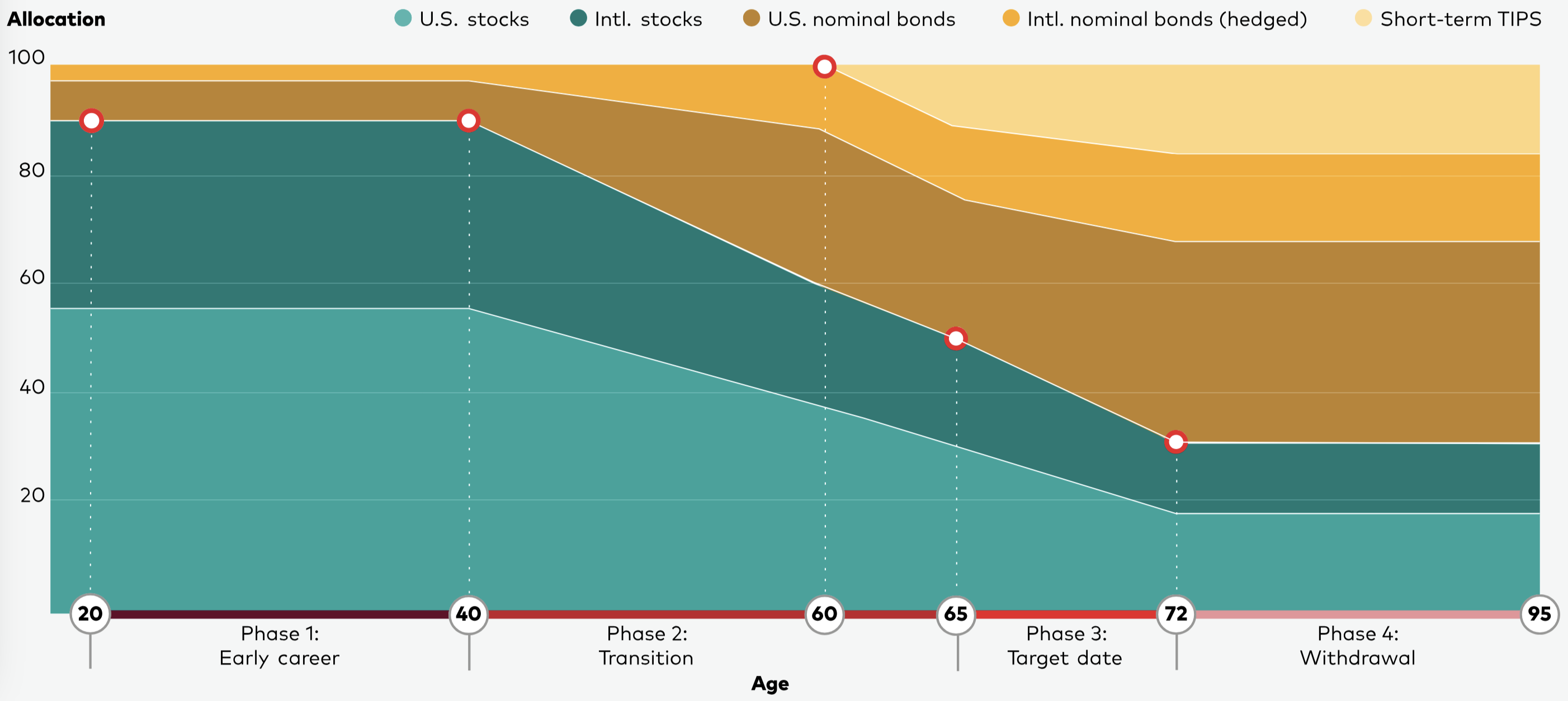 Target date funds combine a few asset classes (typically total US stocks, ex-US stocks, US bonds, ex-US bonds, and short term inflation protected securities) via index funds in a portfolio allocation that adjusts over time as it approaches retirement. They typically start with about 90% stocks that “glide” towards 50%/50% stocks/bonds at retirement (see figure below). They are super simple to invest in because its one fund (abiding by rule #2), costs about 0.1%, and all reputable brokerages will offer them (if they don’t, run for the hills). Vanguard still offers the best though! Index target date funds should represent the largest allocation of your portfolio of portfolios because of their simplicity, low-cost, and “guaranteed” performance relative to benchmarks (they are the benchmark).