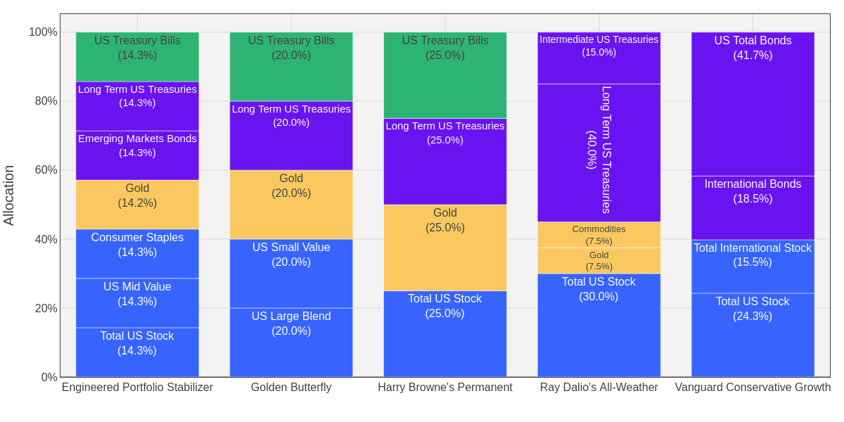 So what are these stabilizing portfolio options you ask! There are four I’ve compared here, each hold a sizable amount of gold. If you’re like my younger self, you may have an allergic reaction to the idea of investing in gold. It doesn’t “do” anything, there are no dividends, and no profit generated. It appreciates value because silly humans have decided it’s valuable. That being said… it does appreciate value. And it appreciates most during both inflationary periods and market downturns. So as a hedge to both stocks (that fall in market downturns) and bonds (that fall during inflation), gold is quite the hedge! One of my previous posts highlighted this: Solving the Great Diversification Debate. Note that this is only true in a portfolio that rebalances regularly (assumed annually in these plots). I minimize tax implications by rebalancing via contributions (adding to under-performers) and withdrawals (selling off out-performers).