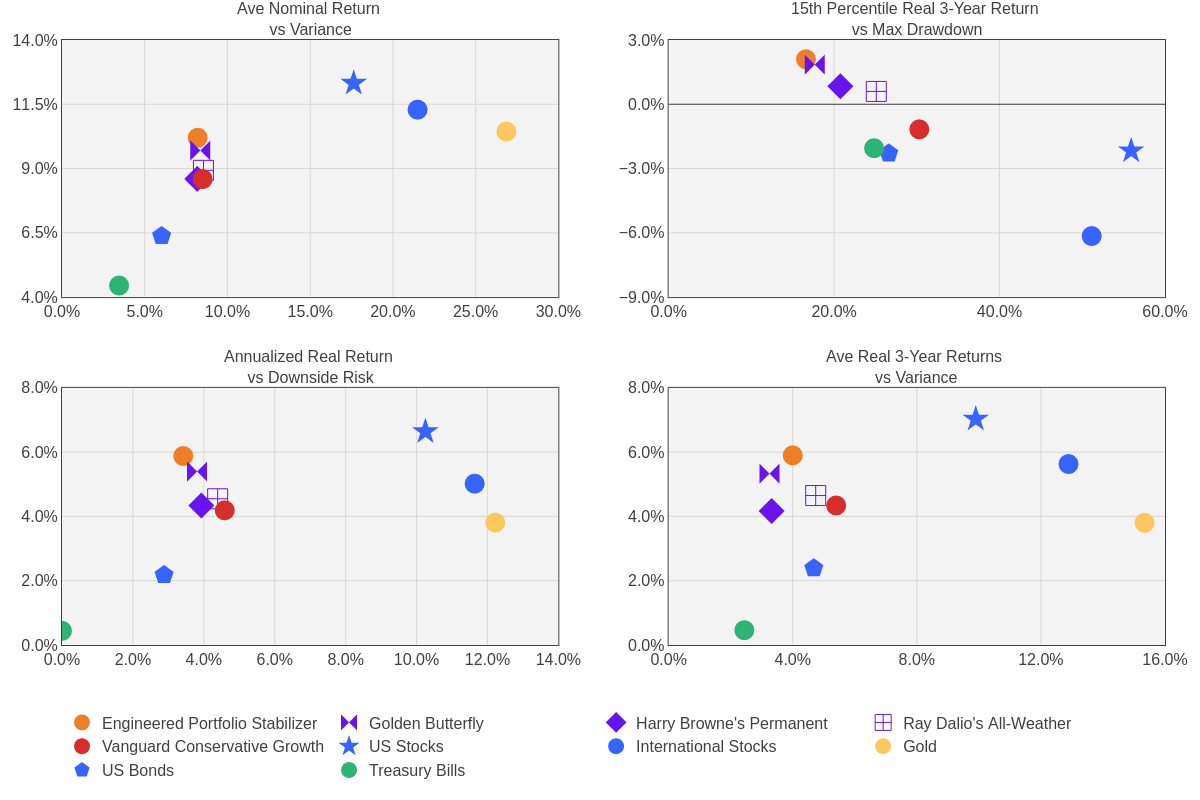 Let’s illustrate this point by plotting the rolling three year annualized real returns (accounting for inflation) of US stocks from 1972 (first data point in 1974) through the end of 2024. We’ll compare this to treasury bills (cash), and I’ve introduced two other lines: Ray Dalio’s All-Weather portfolio, and what I’m calling the “Engineered Portfolio Stabilizer.” Notice that most often the blue line (US stocks) outperforms the orange (Engineered Portfolio Stabilizer) and purple (All-Weather), but not always. And when stocks do poorly, they have done quite poorly, generating in excess of 10% annualized losses for three years in a row. Meanwhile the orange and purple generally stayed steady through those downturns. The time series plot is useful, but next up we’ll plot a bunch of performance vs risk metrics!