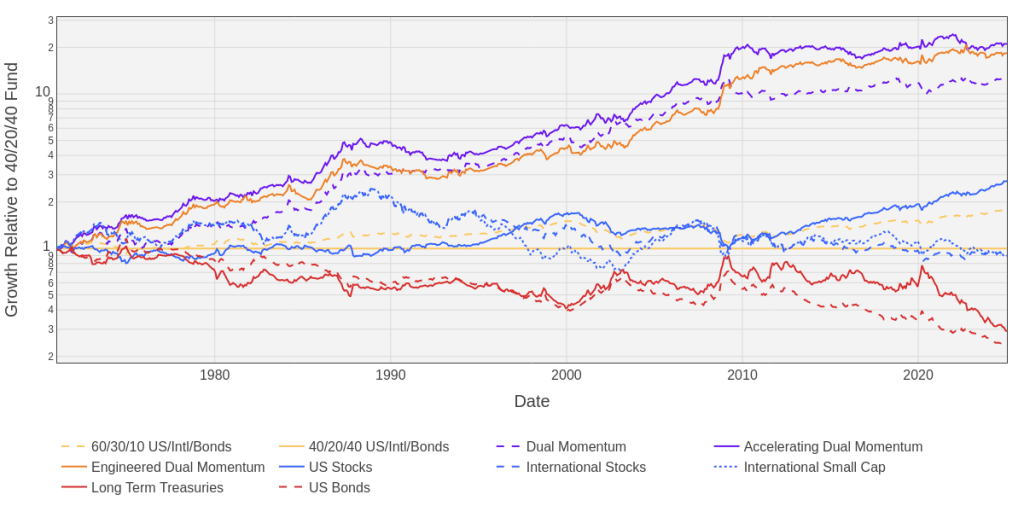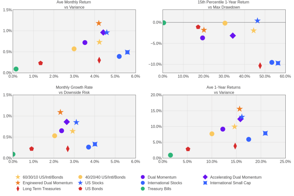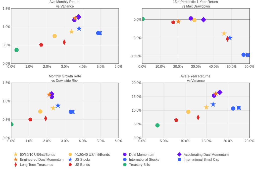 So how did we do through a longer look back period? Using data from 1971 through today, we can plot how the different strategies performed relative to a fixed allocation of 40% US stocks, 20% international stocks, and 40% bonds in Figure 12. Then Figure 13 summarizes the results using our portfolio characteristics metrics. The three momentum strategies performed pretty similarly with Accelerating Dual Momentum doing the best (21x the benchmark) followed closely by Engineered Dual Momentum (18x the growth relative to the benchmark). Gary’s strategy isn’t too far behind although its returns are only 13x the benchmark. When I did some of my initial development of accelerating dual momentum, all I cared about was the final balance. But I’ve since come to learn that the ride itself matters more because you need to weather the ups and downs and past results are by no means a predictor of future returns. So I think this data suggests, if you’re interested in dual momentum, you need to select whichever strategy resonates the most with you and what you think you’ll be able to follow. Relative to our benchmarks these strategies offer the potential to provide similar risk in terms of volatility but muted maximum drawdowns and sustained periods of losses. Yet this improved risk profile still allows, historically, to have beaten the benchmark’s returns… if you can stick to it!