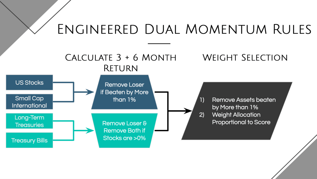 I’ve been meaning to make some improvements to the strategy for a while. And I’ve been recommending cash instead of treasuries to those subscribed to my newsletter in a rising rate environment. So the strategy, if applying rules to pick between treasuries and cash, would have beaten Gary’s in out of sample testing (take that sir!… I’m teasing). But we need some rules to make decisions on data, not intuition, and we need to address the other issues I’ve faced live trading (like whipsaws). Writing this post has finally motivated me to make some modifications to introduce a new strategy called “Engineered Dual Momentum!” Here are the changes and Figure 10 gives an overview of the monthly allocation decision.