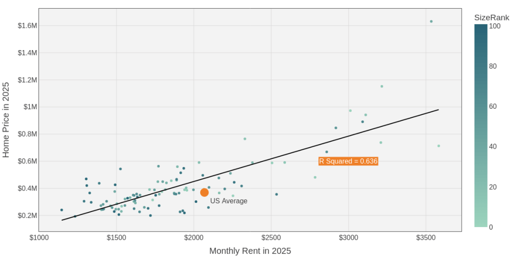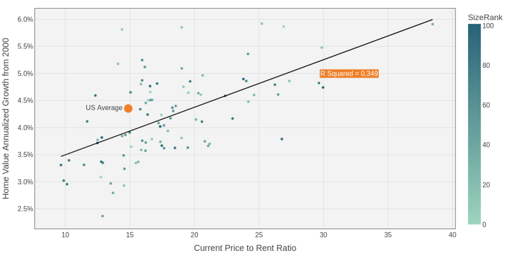 Zillow provides stats on over 900 different cities across the US which I’ve reduced to the top 100 in the plots in Figure 25 that compare several key assumptions which impact the decision of ownership vs renting to maximize your net worth. The Google Sheet (tab Price-to-Rent-Summary) I’ve been using for collecting all data presented in this blog summarizes these markets all ordered by population size. You’ll notice there’s a loose trend between home value metrics and rent metrics, but they vary wildly by different cities, some being much more favorable to home ownership and some being more favorable to renting. The Google Colab I’ve been using for all plots lets you hover over different dots to see which city is which.