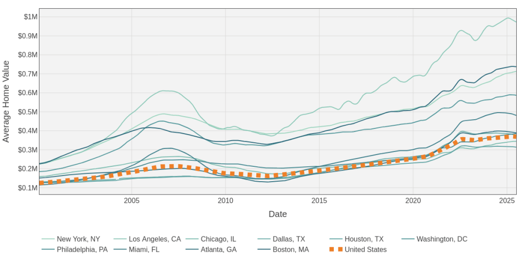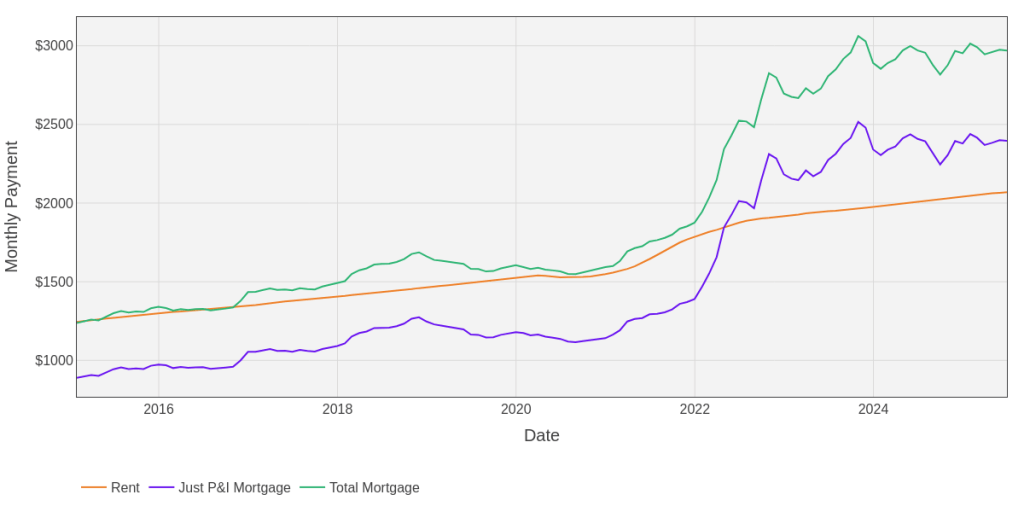 Adding more nuance to the comparison of home ownership to renting is the fact that each real estate market has different home values, rental costs, and trending value/cost appreciation rates. Figure 24 plots the top 10 markets over time that shows that the general trends all correlate but have vastly different starting values and they vary over time slightly differently.