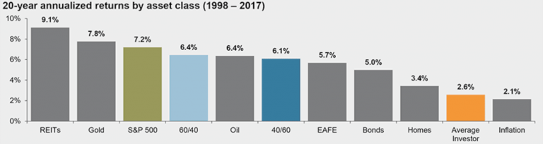 If you’re reading this blog you probably have enough of an interest in investing that you may find it enjoyable and potentially lucrative to pick and time your own investments in individual stocks, crypto, options, etc. instead of the aforementioned passive and rules based strategies. This is why I have my rule #2: keep it simple yet fun! You should give yourself that opportunity but for a small percentage of your overall portfolio. Why small? Because individual investors typically underperform against the overall market. Most studies I’ve read claim that the average investor realizes less than a 3% average return, see Figure 14. And even professional funds underperform (hence the suggestion to invest most of your portfolio in target date funds) on average by 2.8% relative to their benchmark (source).