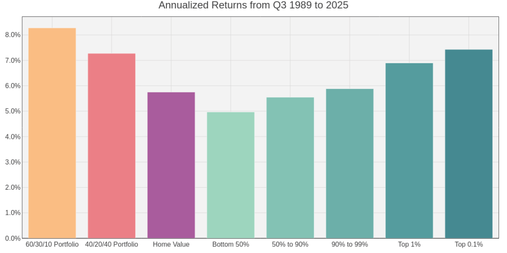 Less than a 3% annual return seems abysmal and possibly under estimated given the typical source: investment companies that want you to pay them to invest for you. So I wanted to find a different data source looking at how the net worth of Americans have grown over the years relative to the market. Figure 15 plots the net worth gains for the bottom 50%, the 50% to 90%, the 90% to 99%, the top 1%, and the top 0.1% while also including the value of owner-occupied real estate in the US and our benchmark portfolios. And Figure 16 compares the annualized returns for this time period of Q3 1989 to now. I know that net worth gains will also include cash flows of savings and withdrawals, but I was surprised that the gains of the net worth of the top 0.1% don’t even beat the gains if invested fully in a portfolio of 40% US stock, 20% international stock, and 40% US bonds.