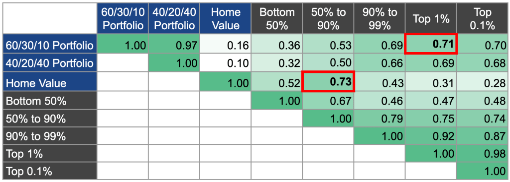 I found it interesting, and validating to using net worth as a proxy for determining average investment gains, by noticing how the total amount of the 50% to 90% net worth Americans tracks closely that of home values whereas wealthier Amercian’s net worth correlates more to the stock market. This suggests that 50% to 90% Amercians have their home representing a large percentage of their overall investment portfolio compared to wealthier Americans having more exposure to the stock market than their home(s). Figure 17 provides a correlation matrix across all net worth percentiles and the benchmark portfolios by looking at the trailing 1-year gain. Again, the net worth gains isn’t the best proxy and it includes a lot of other factors such as income and spending that may outweigh the impact on investment performance. But I think this provides a useful grounding as to how well we collectively do investing. And it reminds us that even the ultra wealthy are barely beating a 60/40 stocks/bonds investment allocation meaning that typical investors are either too conservative or making poor investment decisions throughout the year. Be wary of a high allocation to “mad money” accounts when you’re trying to pick and time your own investments! You could beat the ultra wealthy in investment returns if you just stick to passive rules based investing!