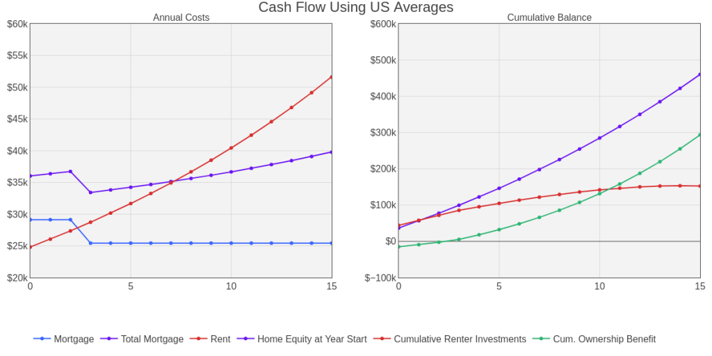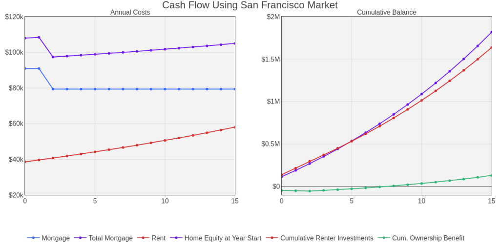 Let’s build a calculator! We can use the Zillow data for key assumptions on the real estate market (home price, price-to-rent, expected home value appreciation, expected rent appreciation, and total mortgage costs). But we also need to account for the interest rate we can expect from a mortgage (typically around 6.5% now, mostly derived by rates set by the Fed), how much of a down payment the buyer puts down, and what type of investment return they could realize elsewhere. I built the calculator in the Google Sheet, tab Mortgage-vs-Rent-Cash-Flow-Calculator, which can be visualized in Figure 26 that shows the cash flow plots for both US national averages and then San Francisco. For each they assume a 6.5% mortgage rate, a 10% down payment, mortgage insurance of 1% (until owning 20% of the home), closing costs of 2%, and an expected investment return elsewhere of 6%.