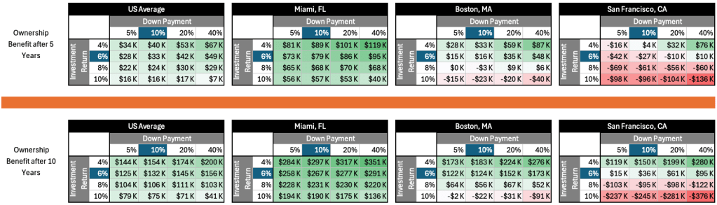 Notice that buying in an average US market is better for your net worth so long as you own it for at least 3 years because the relatively small increase in mortgage costs compared to rent is paid for from the increasing home equity (remember this home equity growth is leveraged because you used debt, that first year of 4.4% price increase equates to a 44% return on your investment when you only put 10% down). And after 7 years, rent costs actually exceed total mortgage costs making the benefit of home ownership start to exponentially rise. But in San Francisco (with the other assumptions we have) it would take 8 years of owning the home to be more beneficial than renting because there is such a large gap between home values and rent costs. And that rental cost increase is only 2.8% per year so even after 30 years the monthly total mortgage cost is more than renting. This means that even with a 5.5% home appreciation and leverage, just renting and investing the money you’d save relative to home ownership is able to keep pace with the increasing home equity you’d have for owning. But these conclusions are still dependent on three other key variables: mortgage rate (which you don’t have much control over), your down payment, and the rate of return you can expect from other investments. Figure 27 varies the down payment and rate of investment return to compare the benefit to your net worth after owning a home for both 5 and 10 years compared to renting.