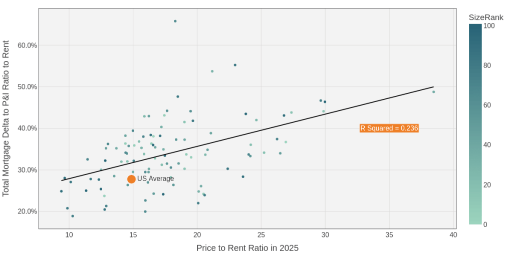 When buying a home you will have a mortgage to pay off the loan principal and interest while also paying for taxes, insurance, and general home upkeep (potentially HOA fees too depending on the building). Whereas a rental payment has just one component, plus utilities which you’d need to pay as an owner too. Figure 23 plots average monthly rent costs in the US compared to the average monthly mortgage (assuming 10% down payment) and a “total mortgage” that includes insurance, taxes, and upkeep. From 2015 through 2021, the average total mortgage payments were pretty comparable to rent costs meaning on a monthly cash flow basis owning a home wasn’t more expensive, yet it had the benefit of some of your costs going to principal. But this was an era of abnormally low interest rates (some have 30 year mortgages below 3%) which have now jumped up to more typical interest rates above 6%. This now makes the monthly cost of owning a home typically higher than renting which adds some nuance to determining which is best for your long term net worth gains. Before we move on, I just want to also highlight that the delta between a total mortgage and just the principal and interest payment tracks about 28% of what rent was, even after the spike in interest rates. So we can use this as a proxy for estimating insurance, taxes, and upkeep moving forward, yet it’s still just an assumption.