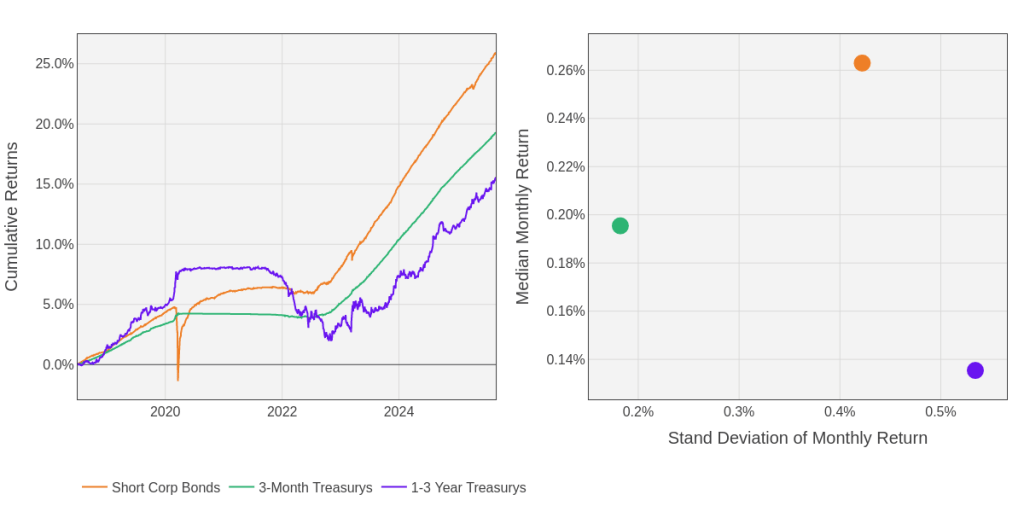 In Figure 19 I’ve compared 3-month treasuries, 2-year treasuries and ultra short corporate bonds which all can be invested in directly with the following ETFs: SGOV for 3-month treasuries, SHY for 2-year treasuries, and PULS for short duration corporate bonds. Notice that the corporate bonds took a 3 month drop of 5% from March through June of 2020 at the start and shock of Covid. It did recover and since has continued to outperform government treasuries, but there’s clearly an added risk here. The longer duration treasuries don’t look attractive though, they may be in some environments, but they will generally have more exposure and risk that generally doesn’t compensate you with proportionally higher returns than just investing in 3-month treasuries.