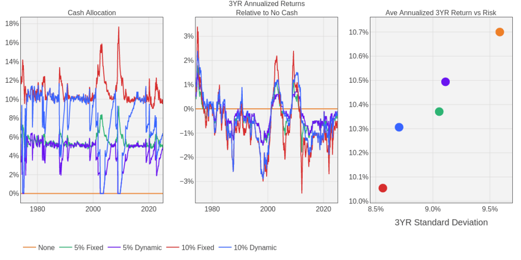 So what did I learn in this? Well, no “cleverness” can overcome the drag on performance holding cash will cause. But the dynamic approach does lessen that drag impact while providing some reduced volatility and peace of mind. The average 3 year return for being fully invested (remember this isn’t a 1-to-1 with investment returns because I’m injected new cash every month) was 10.7% with a standard deviation of 9.6%, a Sharpe ratio of 1.12. But the 10% dynamic model reduced returns by 0.4% while reducing volatility by 0.9%. That is proportionally higher reduction in risk than reduction in overall return, especially when compared to the static allocation that sees returns drop by 0.6% and risk drop by 1%. So, I’ve answered the question that I should be deploying cash based upon market downturns but I’m still torn on what my baseline cash allocation should be.