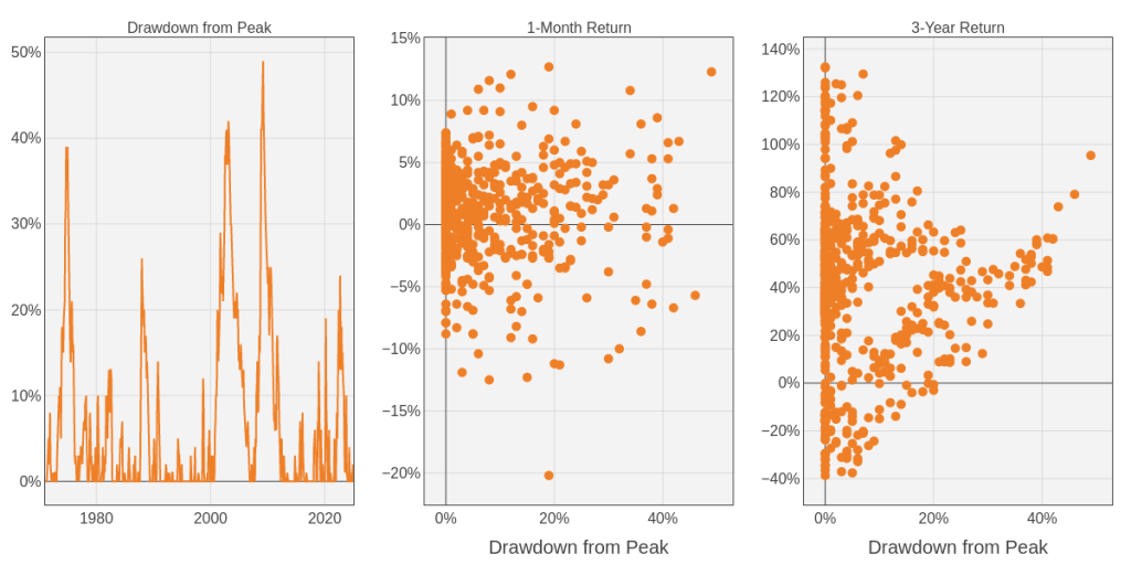 But how much cash should we hold, and should we be willing to deploy it in market downturns? To answer that question, let’s start by plotting drawdowns of the S&P500 over time in Figure 20 comparee to how well the market performed in the following month and following 3 years. There have been some rough downturns as we’ve discussed before in the “portfolio stabilizer” section that didn’t have any correlation to how well the market performed the following month. But notice there is some correlation to larger drawdowns tending to signal larger 3-year returns that follow. But that correlation certainly isn’t perfect and the highest 3-year returns of over 100% have all been off of peaks the market was already making.