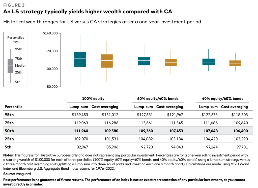 So what happens when you either get a big payday (gift, bonus, inheritance, etc.) or have a big expense (home, renovations, etc.)? Vanguard published a really insightful article on Cost Averaging which I’ve included an image of in Figure 22. Because the market tends to be going up, dollar cost averaging (the act of breaking up the lump sum investment into 3 equal parts and investing a month apart) underperforms 95% of the time. And that underperformance is typically several thousand dollars on a $100K base. That is a big price to pay!