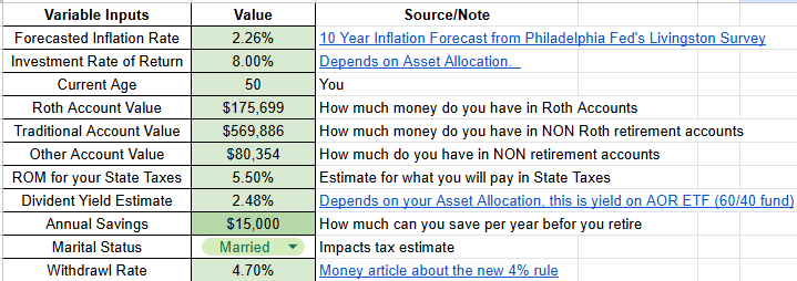 The Johnsons have done a pretty good job, they have $825,939 in financial assets across all of their accounts. Here are all the inputs for the Johnsons: